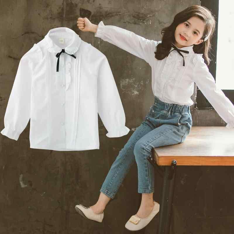 ブラウス 女の子 キッズ ジュニア 長袖 リボン フリル 襟付き 韓国風 コットン カジュアル 普段使い 小学生 通学 ガールズ フェミニン ホワイト