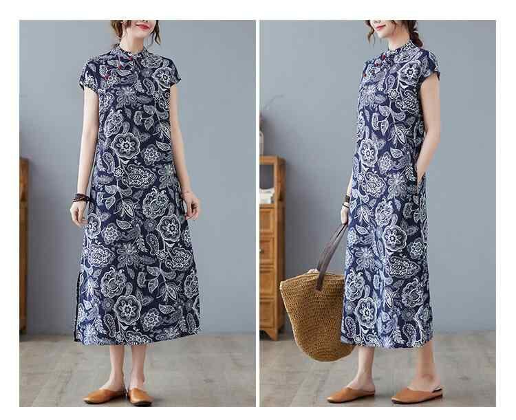 ワンピース レディース 大きいサイズ 夏用 ラミー麻 苧麻 中華風 民族風 ナチュラルスタイル 改良チャイナドレス 花柄 ロング丈 Aライン 体型カバー ゆったり タウンユース お洒落 着心地快適 通気性 軽量