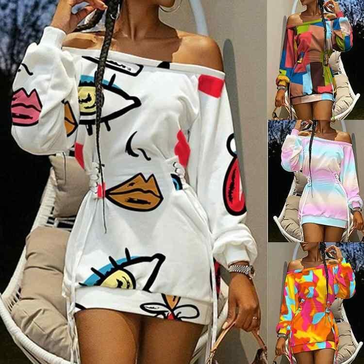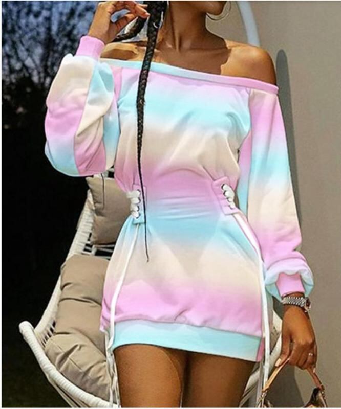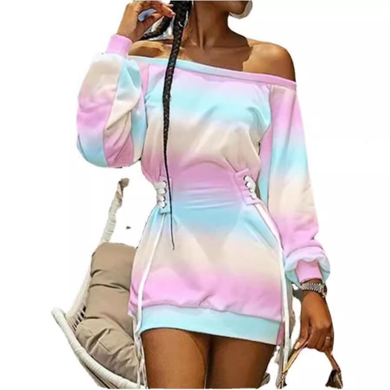 ワンピース レディース ラウンドネック 長袖 ゆったり ルーズフィット タイダイ柄 プリント ショート丈 アシンメトリーヘム ハイウエスト ポリエステル カジュアル 普段使い 通勤 リラックス