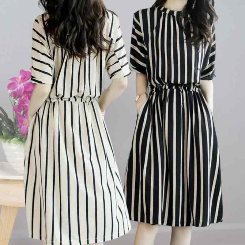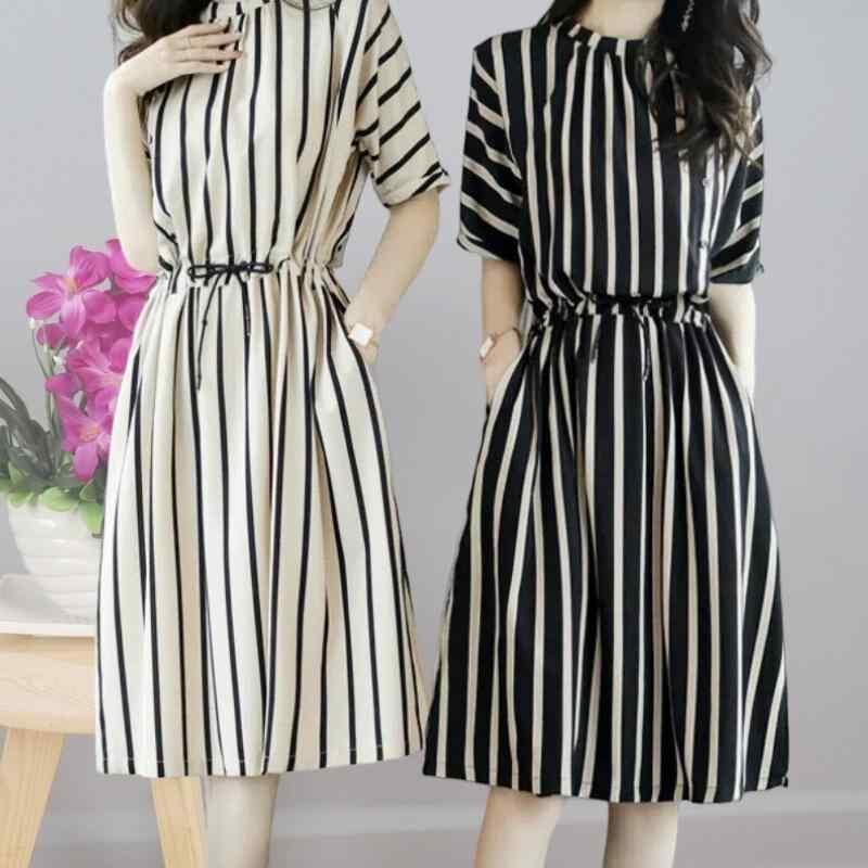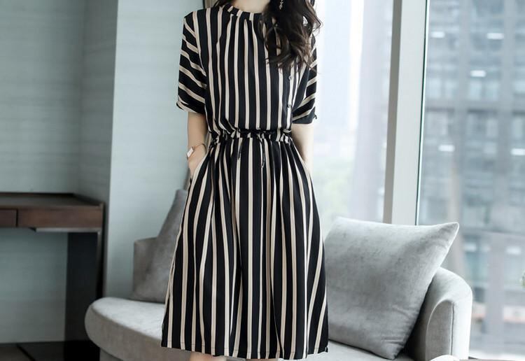 ・カテゴリ: ワンピース ・スタイル: 通勤、リラックスカジュアル ・主な素材: ポリエステル 90~95%、スパンデックス 30%以下 ・柄: ストライプ ・加工: プリント ・ネックライン: クルーネック ・袖丈: 半袖 ・袖の形: レギュラー袖 ・丈: ミディ丈 ・スカートの形: Aライン ・ウエスト: ミドルウエスト ・カラー展開: ホワイト、ブラック ・サイズ展開: M、L、XL、XXL、XXXL