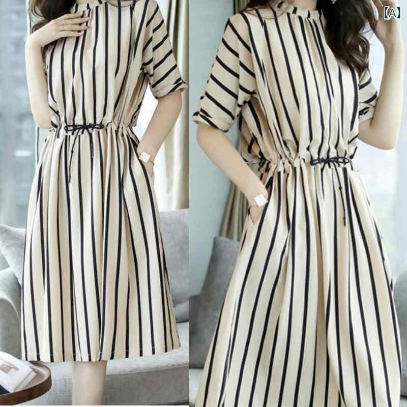 ワンピース レディース 韓国風 ストライプ柄 ゆったり ウエストマーク ミディ丈 半袖 ポリエステル Aライン 体型カバー カジュアル 大きいサイズ 夏服