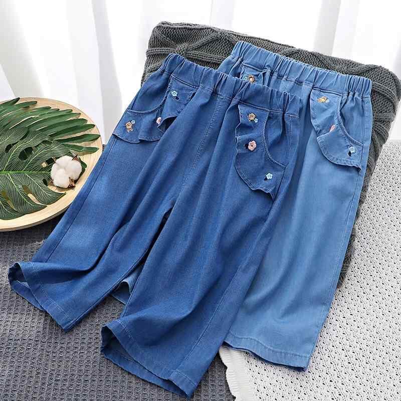 デニムパンツ 女の子 キッズ ストレッチ 七分丈 薄手 テンセル 再生繊維 伸縮性 ポケット 刺繍 接触冷感 夏用 ボトムス カジュアル 通園 通学 普段使い かわいい 韓国風