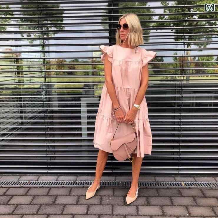 ワンピース レディース 夏 無地 レトロ ゆったり 大きいサイズ カジュアル ラウンドネック 半袖 フリル袖 Aライン ミニ丈 ポリエステル素材 おしゃれ 上品
