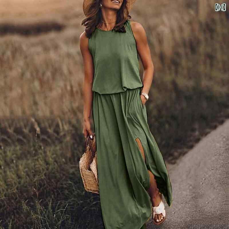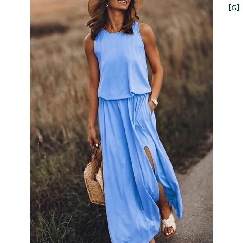 ワンピース レディース ノースリーブ クルーネック ロング丈 スリット入り モダール ポリエステル 無地 ゆったりシルエット きれいめ 上品 エレガント 通勤 オフィス カジュアル 普段使い