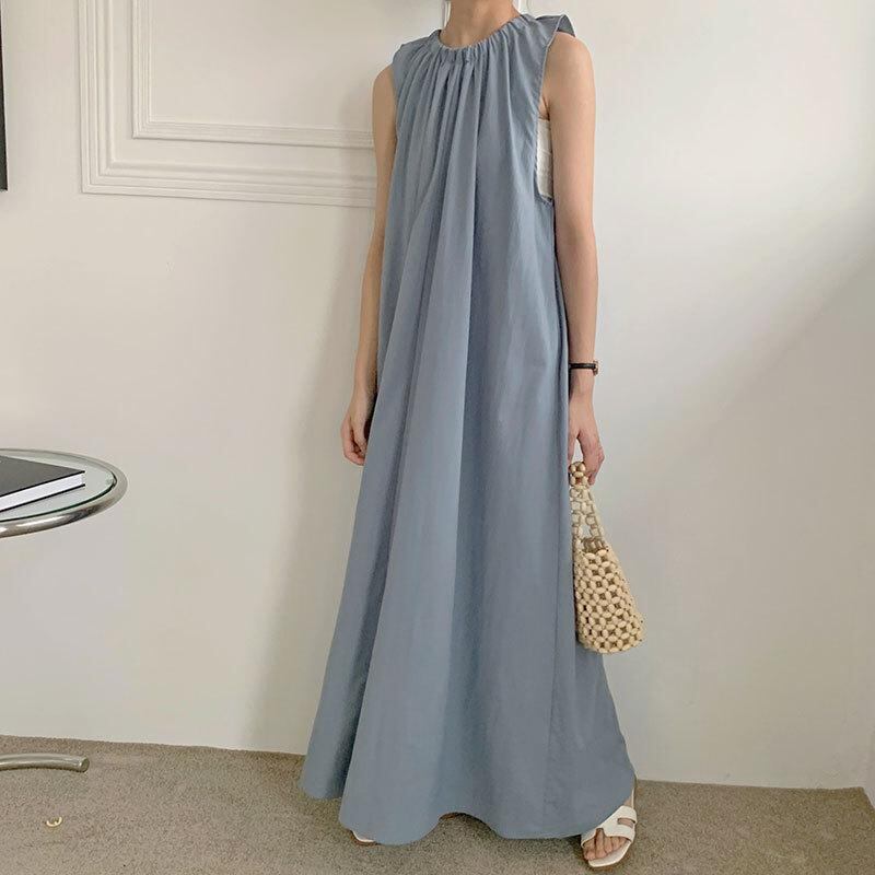 ・カテゴリ: ワンピース・スタイル: 日韓カジュアル・柄: 無地・スカート丈: ロング丈・ネックライン: クルーネック・袖丈: ノースリーブ・カラー展開: ブルー、ブラック、アプリコット・サイズ展開: フリーサイズ