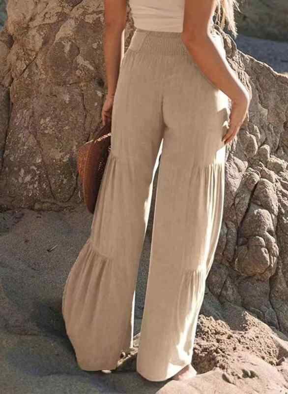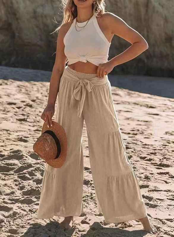 カジュアルパンツ レディース ハイウエスト プリーツ ワイドパンツ ゆったり リラックス ロング丈 きれいめ 通勤 オフィススタイル 綿麻 コットン ストレッチ 切り替え 飾り紐