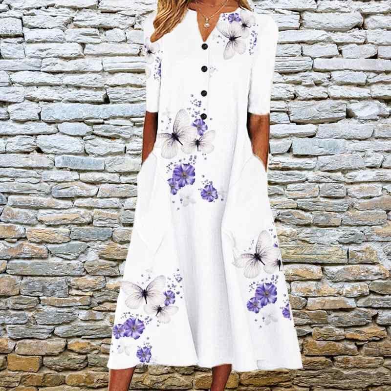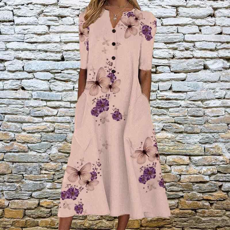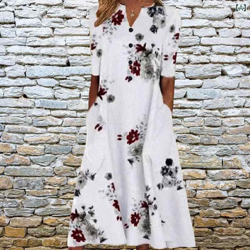 ワンピース レディース Vネック ロング丈 花柄プリント 半袖 ゆったり カジュアル 上品 エレガント ポリエステル素材 ポケット付き Aライン ミドルウエスト ボタニカル柄 通勤 オフィススタイル 女性用