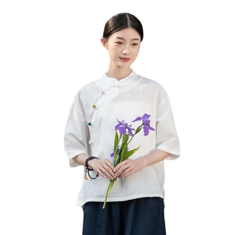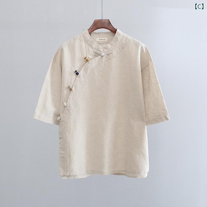 シャツ レディース 綿麻 レトロ スタンドカラー 偏襟 薄手 配色 飾りボタン 半袖 ゆったり プルオーバー 切り替え トップス