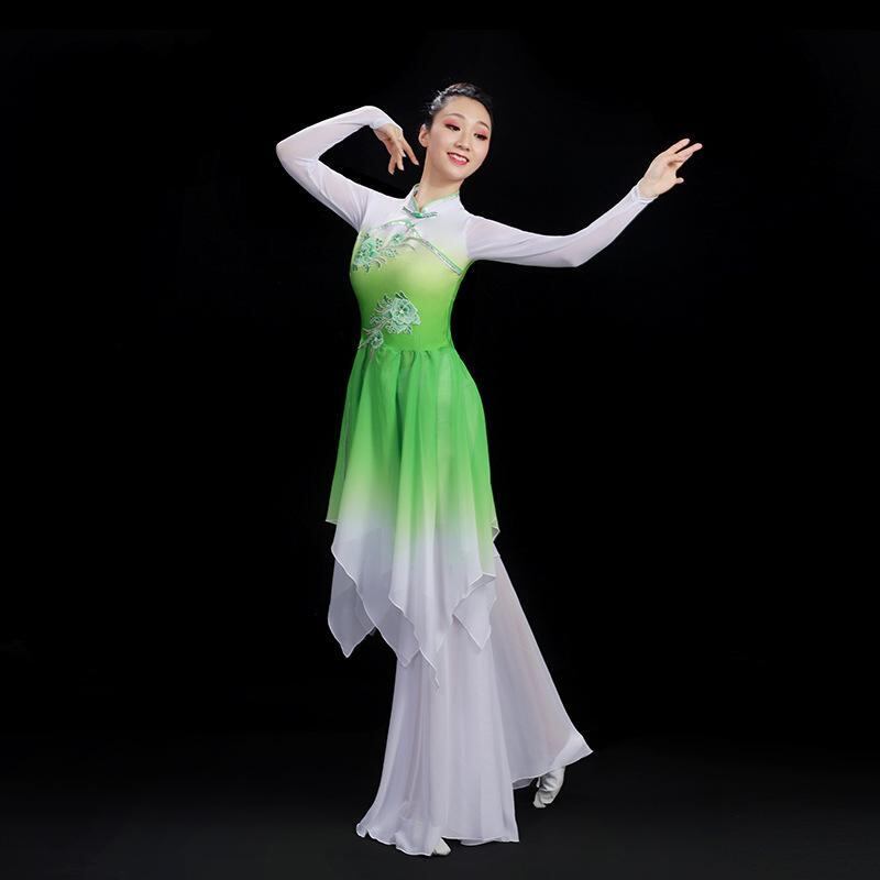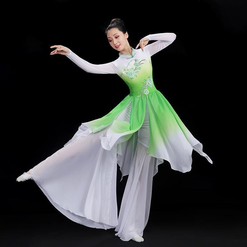 舞踊衣装 レディース 中国風 古典舞 優雅 軽やか ポリエステル素材 化学繊維混紡 グリーン セットアップ 扇子舞 广场舞 秧歌服 舞台発表会用 ステージパフォーマンス 練習着