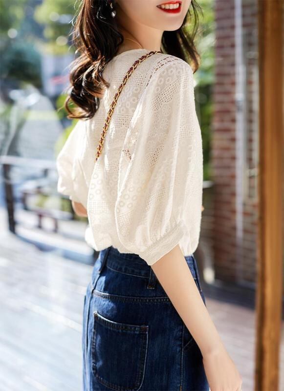 ブラウス レディース レース 半袖 韓国風 ゆったり フェミニン かぎ編み パフスリーブ ラウンドネック プルオーバー ポリエステル 無地 ホワイト ドール風 カジュアル オフィス 通勤 きれいめ 上品 トップス