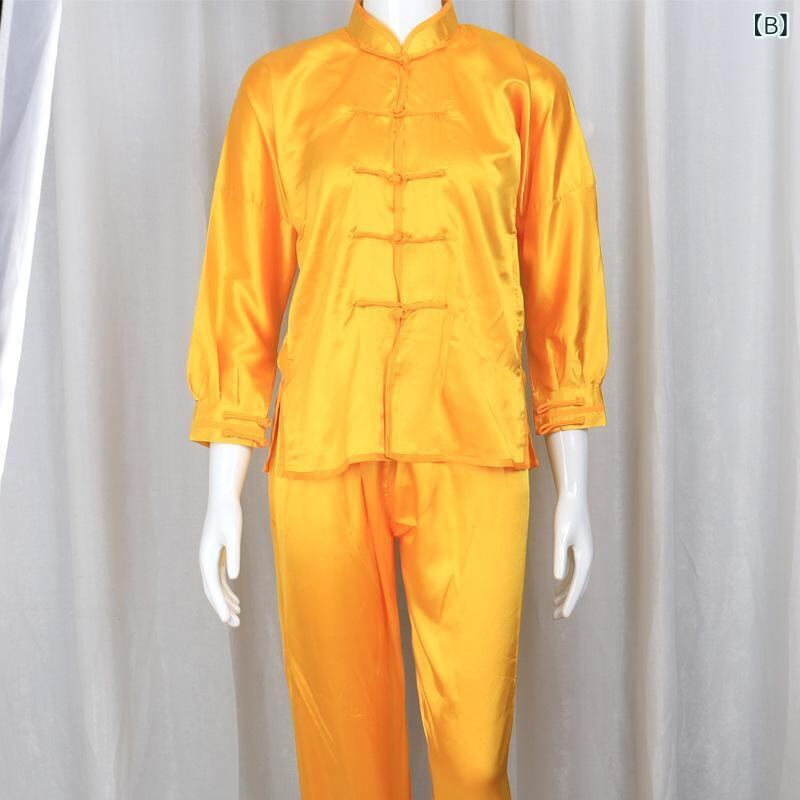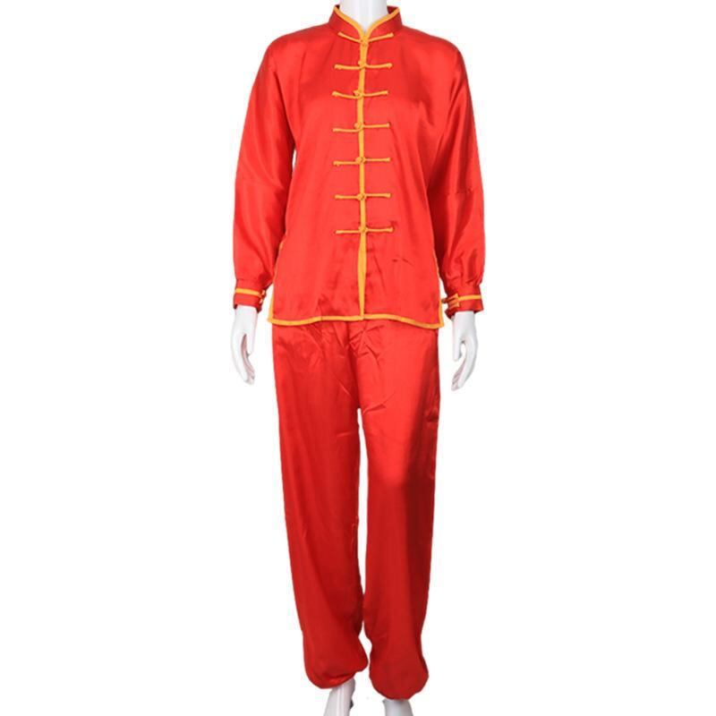 太極服 男女兼用 中高年 シニア 子供 キッズ 武術服 練習着 稽古着 演武服 パフォーマンスウェア 朝練 太極拳 詠春拳 ウェア 上下セット 伸縮性 ポリエステル シルク調 ストレッチ素材 赤 黄 ピンク