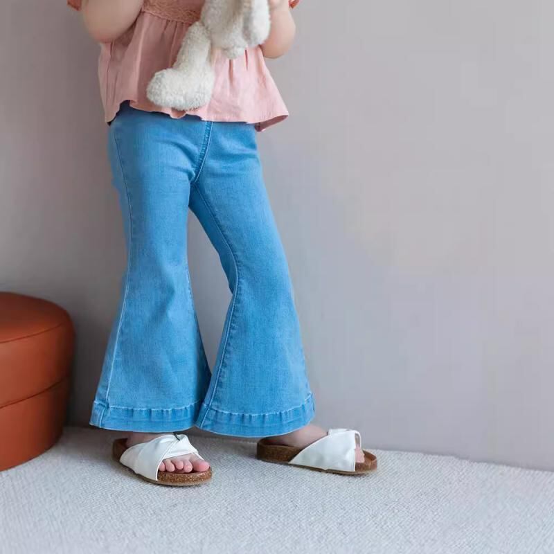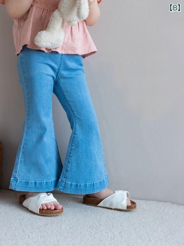 デニムパンツ 女の子 キッズ フレアパンツ ストレッチ 伸縮性 スリム 細身 美脚 ハイウエスト ウエストゴム 綿混 柔らか素材 無地 韓国風 トレンド カジュアル 子供服 ダークブルー ライトブルー