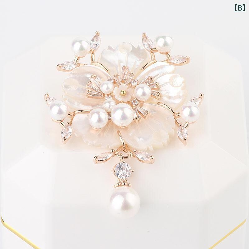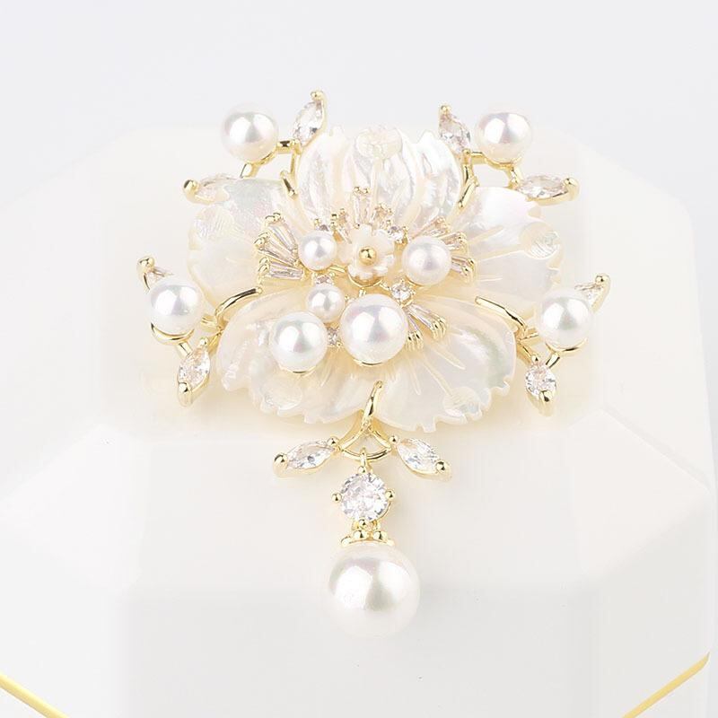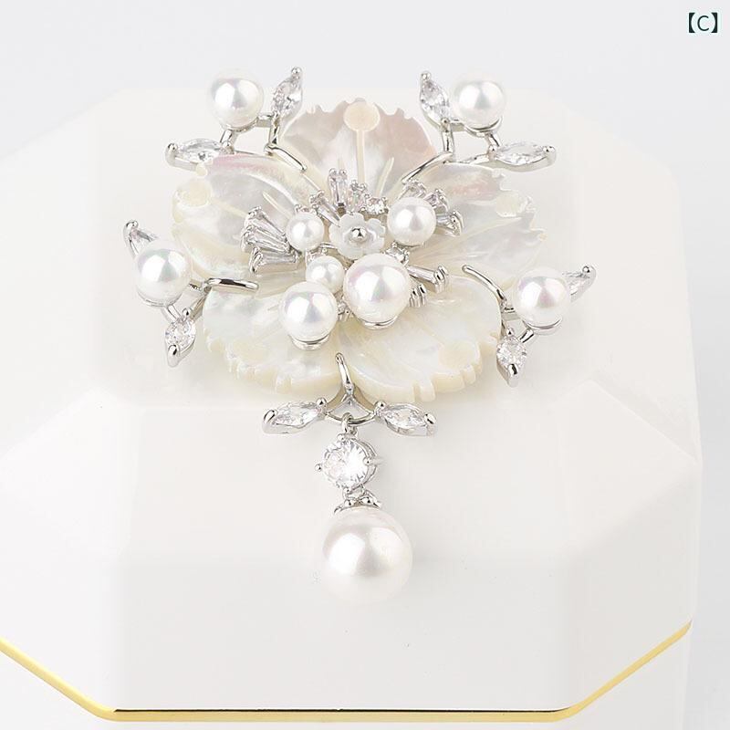 ブローチ レディース 韓国風 おしゃれ エレガント パール 花 シェル CZダイヤ 上品 ゴールド ローズゴールド プラチナカラー ホワイトシェル フォーマル ドレス スーツ コート ジャケット 華やか 結婚式 入学式 卒業式 パーティー アクセサリー
