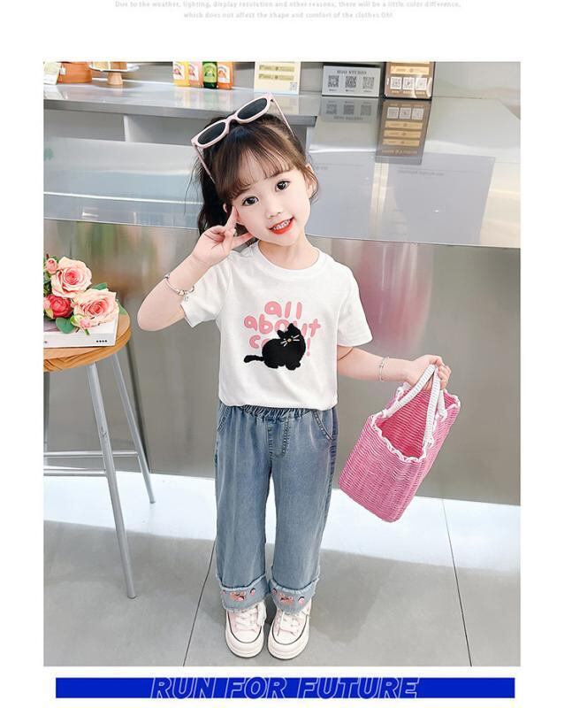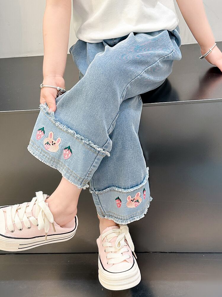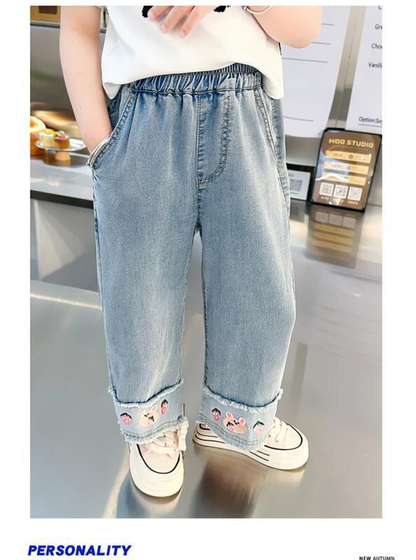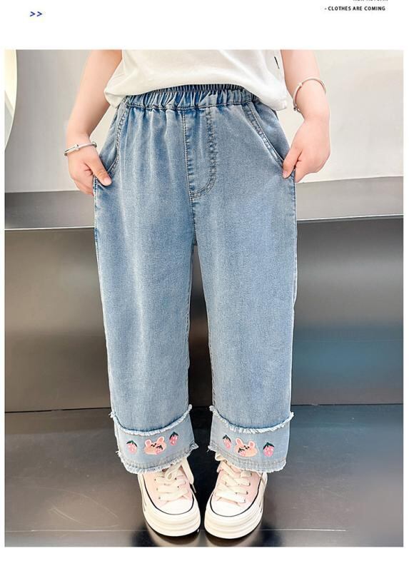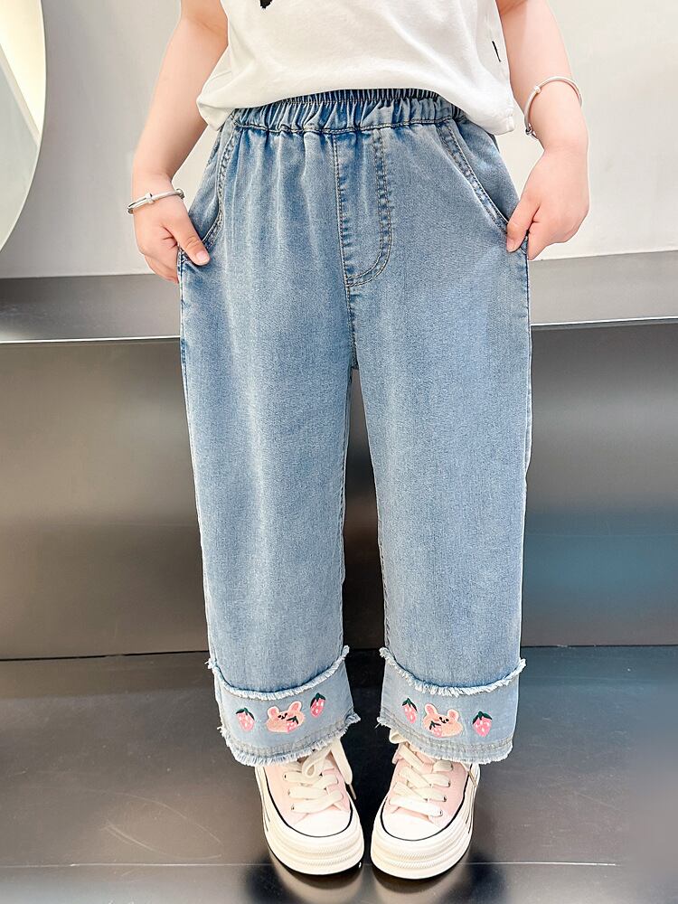 デニムパンツ 女の子 キッズ 子供 夏 薄手 韓国風 カジュアル 綿 コットンブレンド 再生繊維 接触冷感 柔らかい 軽量 ワイド ストレート ブルー ウエストゴム 普段使い
