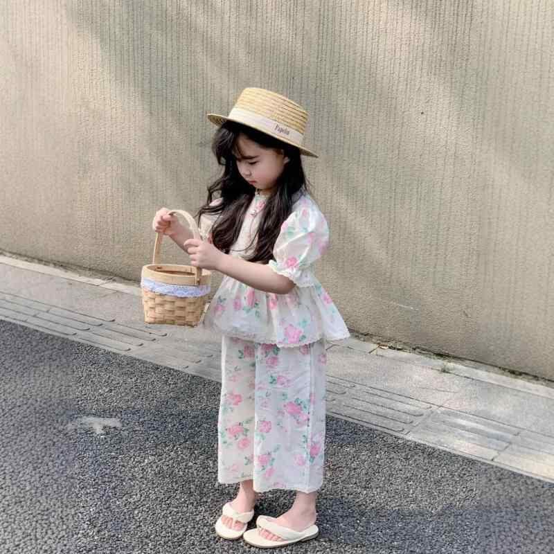 セットアップ キッズ 女の子 フレンチ スタイル 総柄 小花柄 レース 半袖 シャツ ゆったり ワイドパンツ 七分丈パンツ ワンマイルウェア ルームウェア 普段使い お出かけ かわいい ポリエステル 柔らか素材 2点セット 夏