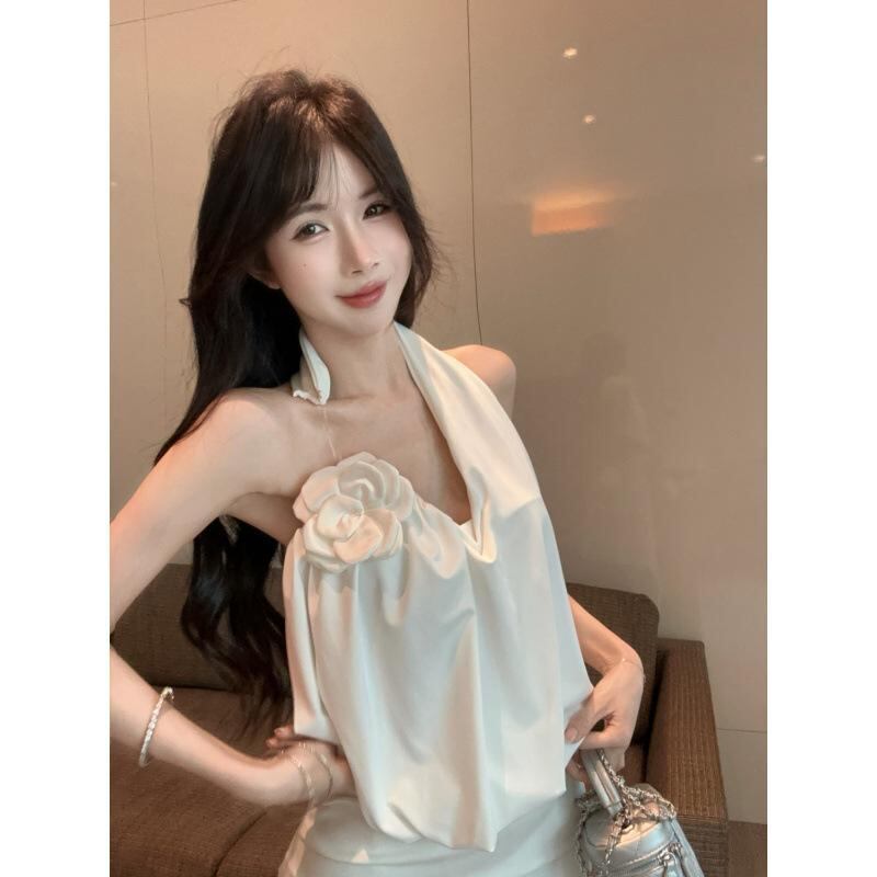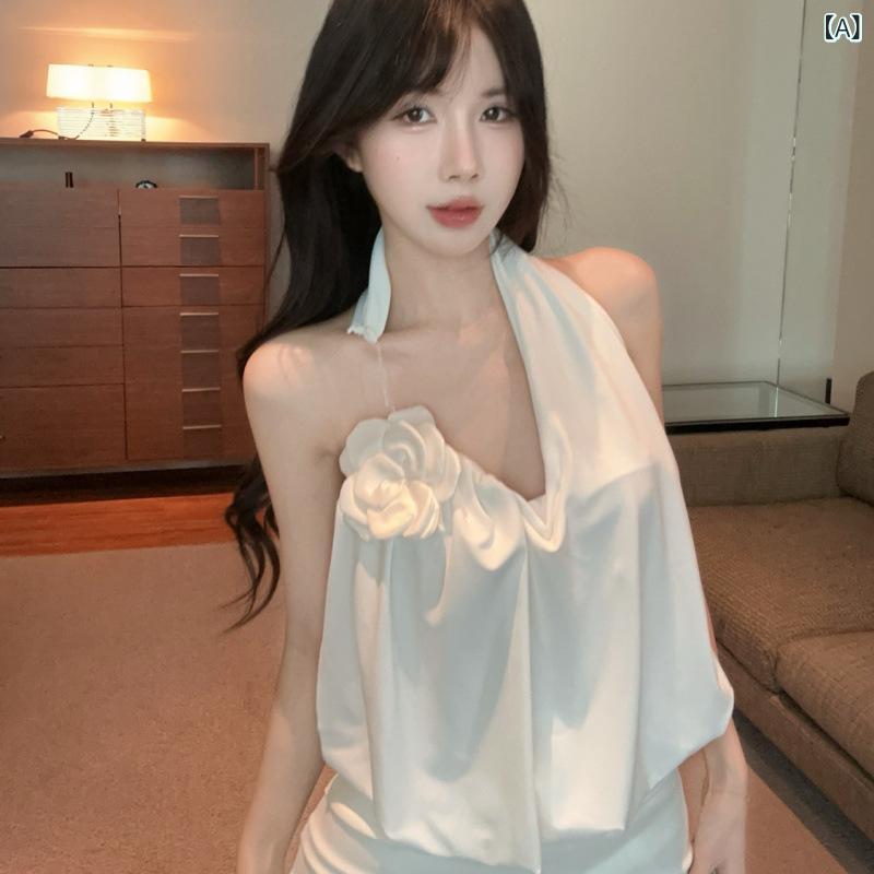 トップス レディース ホルターネック キャミソール ノースリーブ 立体フラワーモチーフ バックオープン カップ付き ポリエステル素材 無地 アシンメトリー 上品 きれいめ 大人女子 セクシー フェミニン デイリーユース お出かけ ホワイト