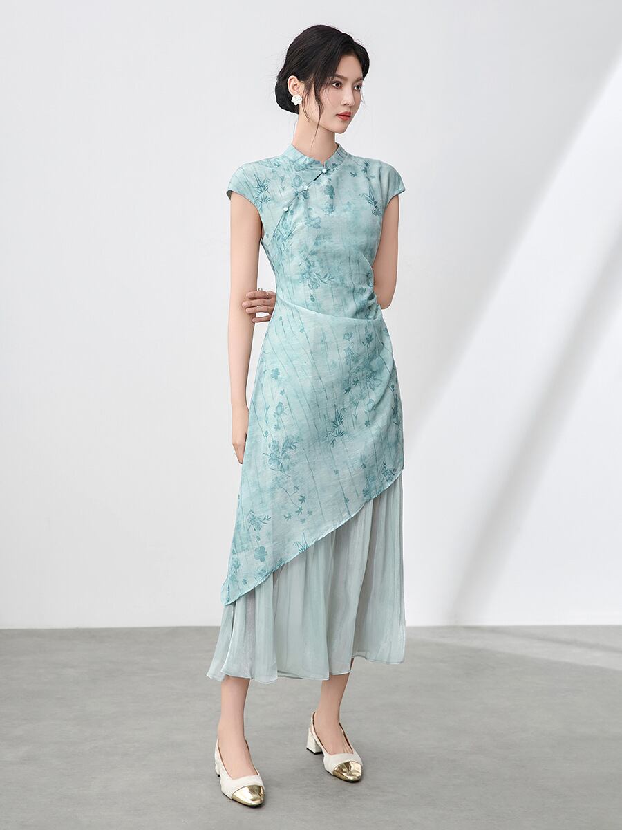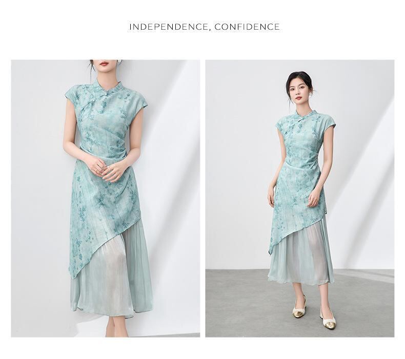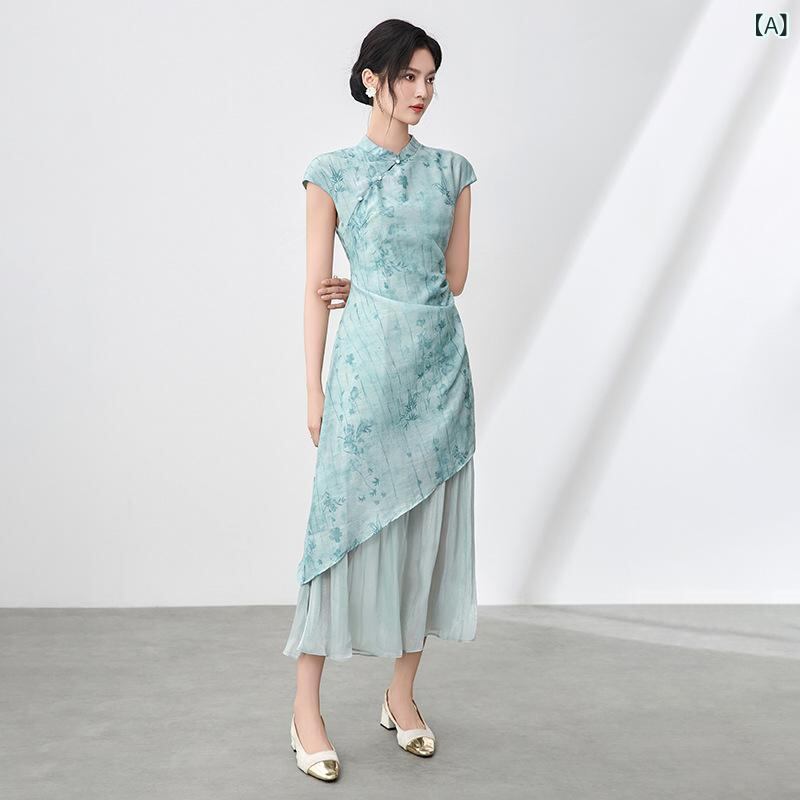 ワンピース 中国風 チャイナドレス風 エレガント 上品 フェイクレイヤード 重ね着風 スタンドカラー ノースリーブ ジャガード織り 地紋 花柄 プリーツ切り替え ミモレ丈 光沢 シアー ポリエステル グリーン ピンク