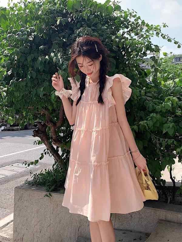 ワンピース レディース フェミニン スウィート ガーリー 夏 サマー 小柄 低身長 細見え 着痩せ効果 ゆったり リラックスフィット Aライン ショート丈 ミニ丈 ハイウエスト フリル袖 ラウンドネック 無地 ポリエステル ピンク系 イエロー系