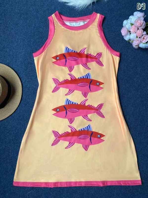 ワンピース レディース ラウンドネック ノースリーブ ゆったり Aライン 欧米スタイル ストリートファッション ポリエステル ショート丈 抽象柄プリント リゾート
