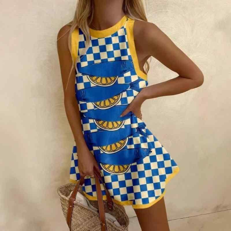 ・カテゴリ: ワンピース ・スタイル: ストリートカジュアル ・素材: ポリエステル 90~95%、スパンデックス 5~10% ・ネックライン: クルーネック ・袖丈: ノースリーブ ・柄: 抽象 ・加工: プリント ・カラー展開: レッドホワイト、ピンクイエロー、ブルーチェック、ブルーベージュ ・サイズ展開: S、M、L、XL、XXL、XXXL ・スカート丈: ミニ丈 ・スカートシルエット: Aライン ・ウエストタイプ: ミドルウエスト ・開閉: プルオーバー