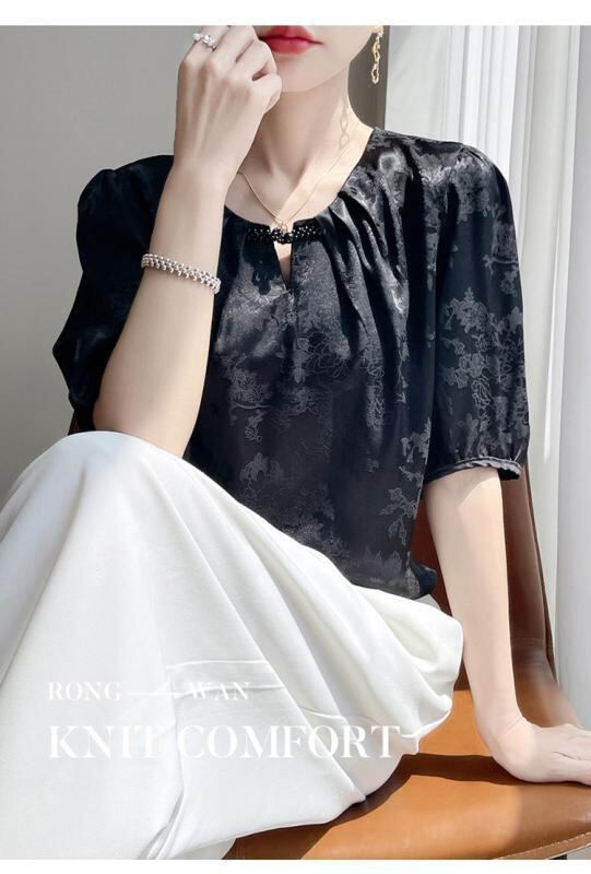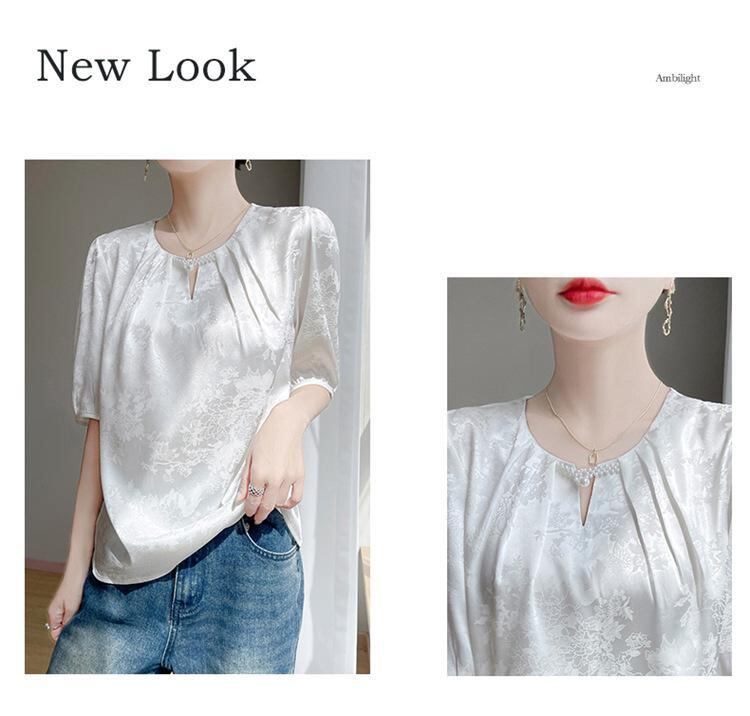 ブラウス レディース シフォン 五分袖 ジャガード サテン 花柄 プルオーバー ラウンドネック シンプル 通勤 オフィス エレガント ポリエステル レギュラー丈 ブラック ホワイト シャンパンカラー