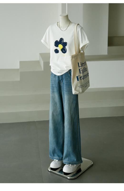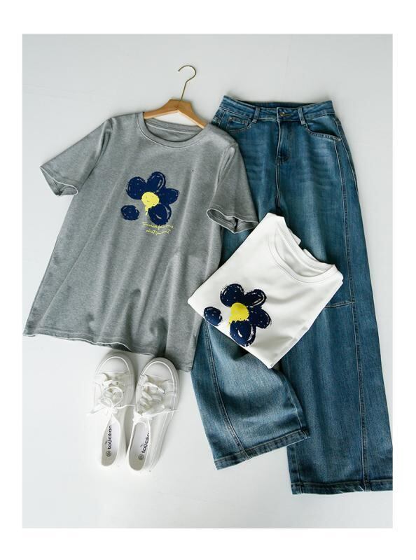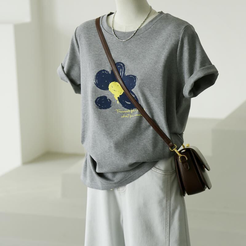 Tシャツ レディース 花柄 半袖 丸首 クルーネック ゆったり オーバーサイズ 体型カバー シンプル カジュアル 綿 コットン素材 着回し ストリートファッション 韓国風 快適 リラックスフィット ホワイト ライトグレー