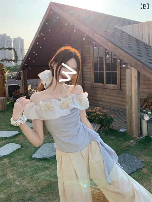 Tシャツ レディース トップス オフショルダー 花柄 アシンメトリー ドレープリボン スリムフィット 半袖 夏物 ポリエステル カジュアル 純欲スタイル