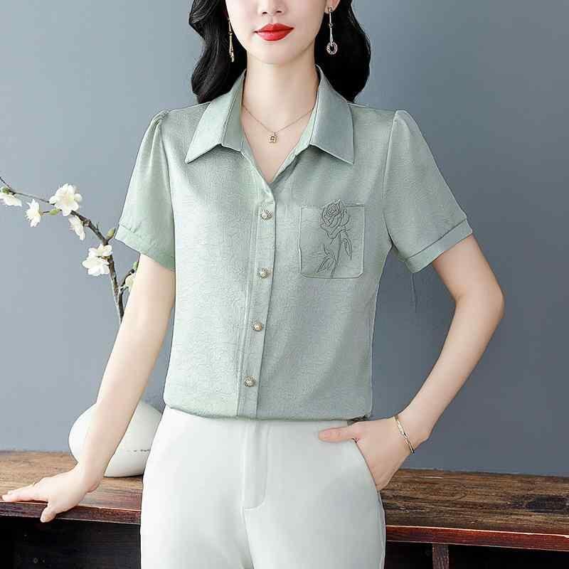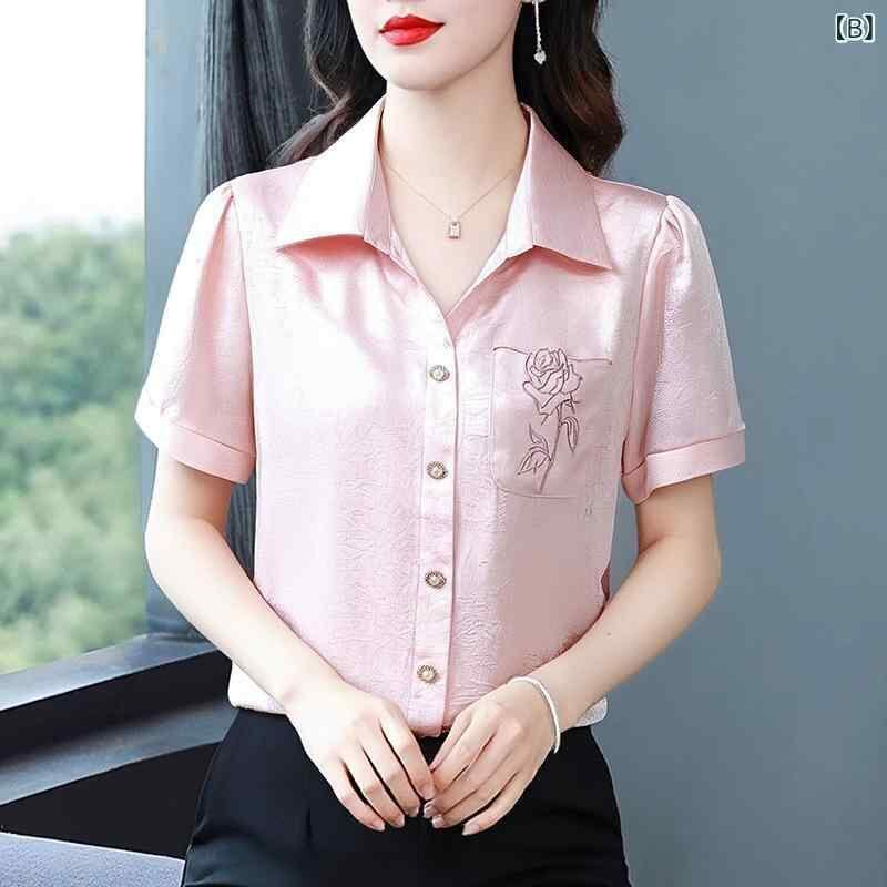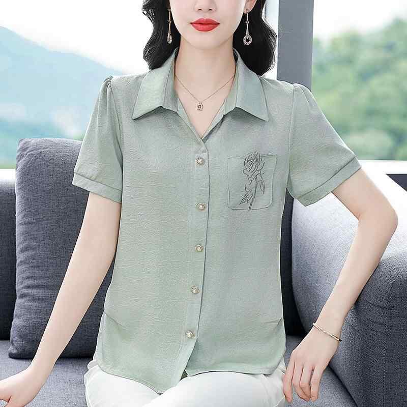 ・カテゴリ: ブラウス・スタイル: エレガント、通勤・素材: アセテート、シルク30~50%未満・柄: 植物花柄・タイプ: 開襟・袖丈: 半袖・加工: 刺繍・シルエット: ウエストシェイプ・着丈: 約50~65cm・ネックライン: 襟付き・袖タイプ: レギュラー袖・デザイン要素: ボタン、ポケット・カラー展開: ライトグリーン、ダスティピンク・サイズ展開: M、L、XL、XXL、XXXL、XXXXL