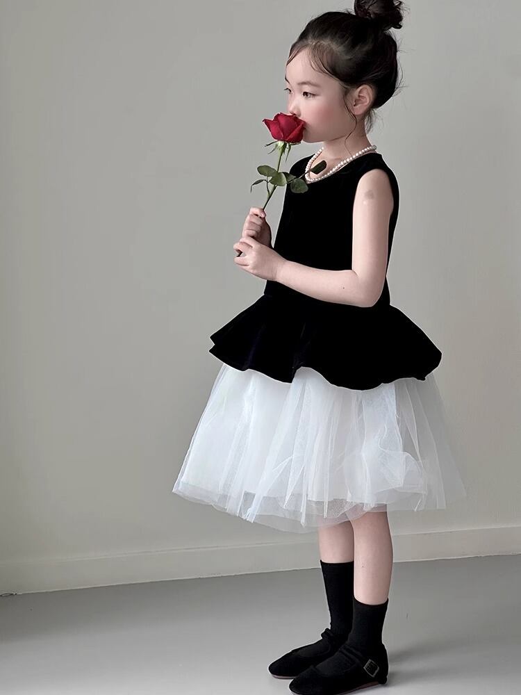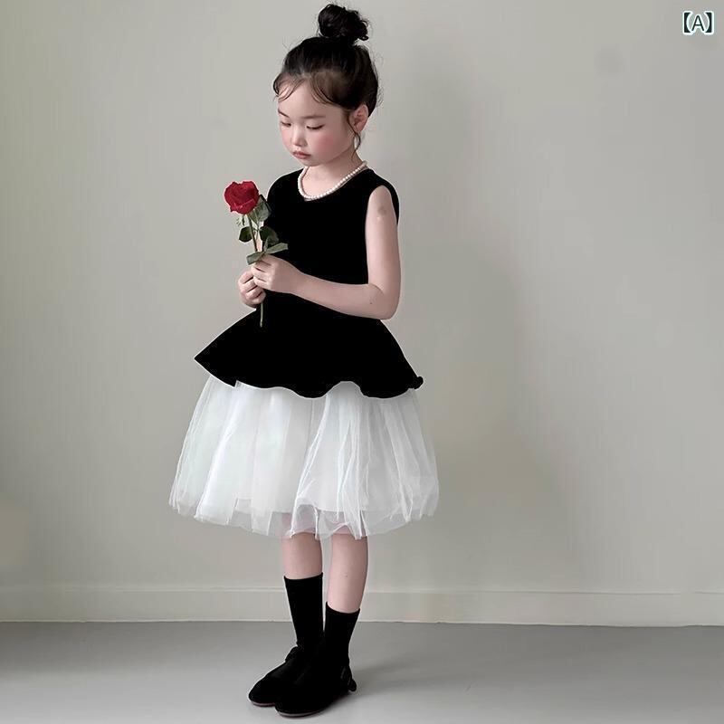 ワンピース 女の子 プリンセスドレス フォーマル ノースリーブ お嬢様風 高級感 夏 上品 エレガント コーデュロイ 黒 白 配色 ポリエステル