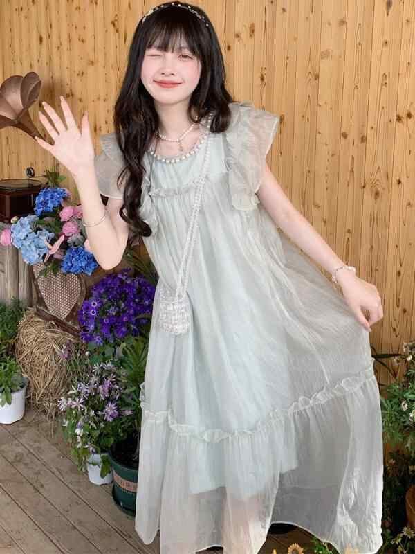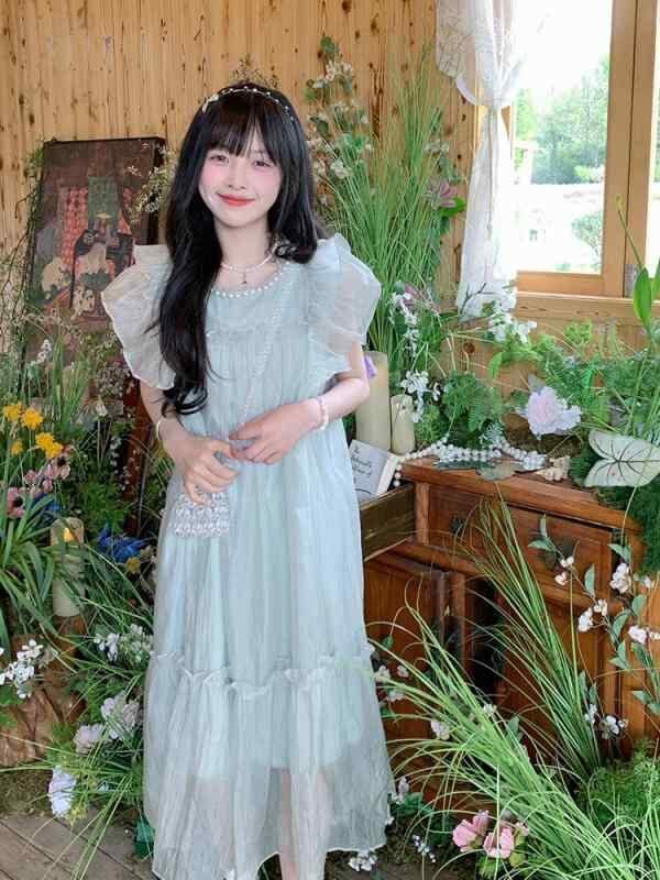 ワンピース レディース フリル袖 半袖 立ち襟 スタンドカラー 木耳フリル 高級感 上品 エレガント Aライン ロング丈 ゆったり リラックスフィット パッチワーク カレッジ風 プレッピー スウィート ストリートカジュアル 夏 サマー