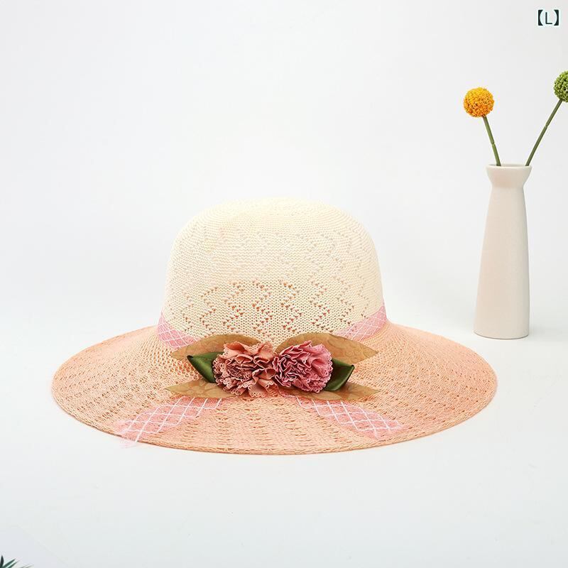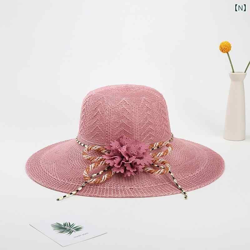 麦わら帽子 レディース 夏用 日焼け防止 UVカット つば広 ハット ビーチハット 海辺 リゾート 旅行 お出かけ 草編み ストロー素材 花モチーフ バイカラー ラウンドトップ 通気性 サンハット