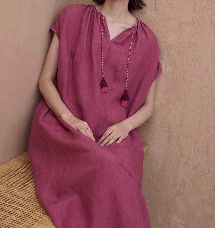 ワンピース レディース リネン 植物染め ゆったり 着痩せ Vネック 半袖 レトロ ミニマル 上品 ロング丈 リゾート バカンス プラムカラー 通勤 普段使い カジュアルスタイル