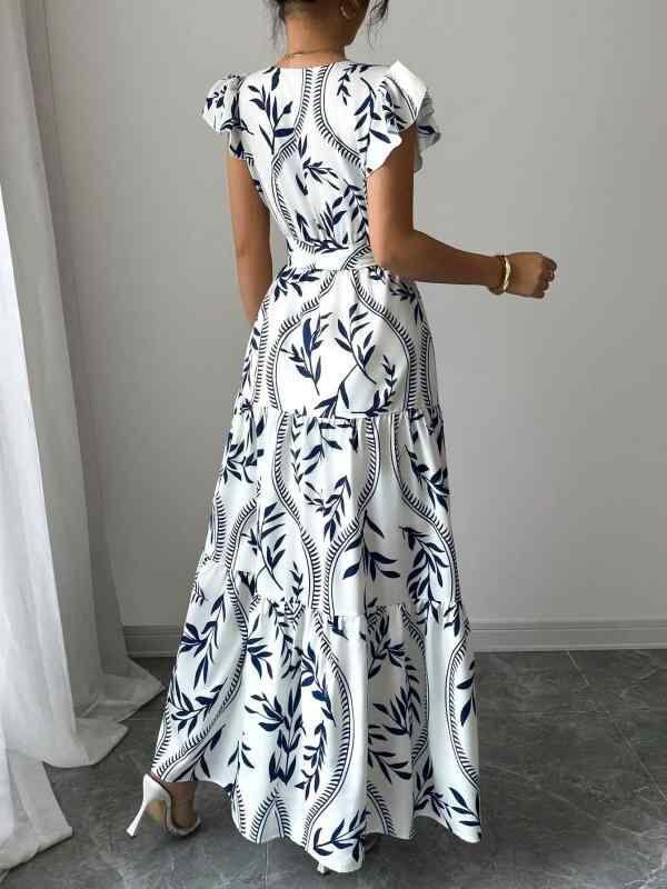 ワンピース レディース プリント柄 フリル Vネック パフスリーブ 長袖 ハイウエスト スリムフィット 細見え ロング丈 ティアードスカート ドレス アセテート ポリエステル ホワイト 大人かわいい フェミニン エレガント 普段使い フォーマル お呼ばれ