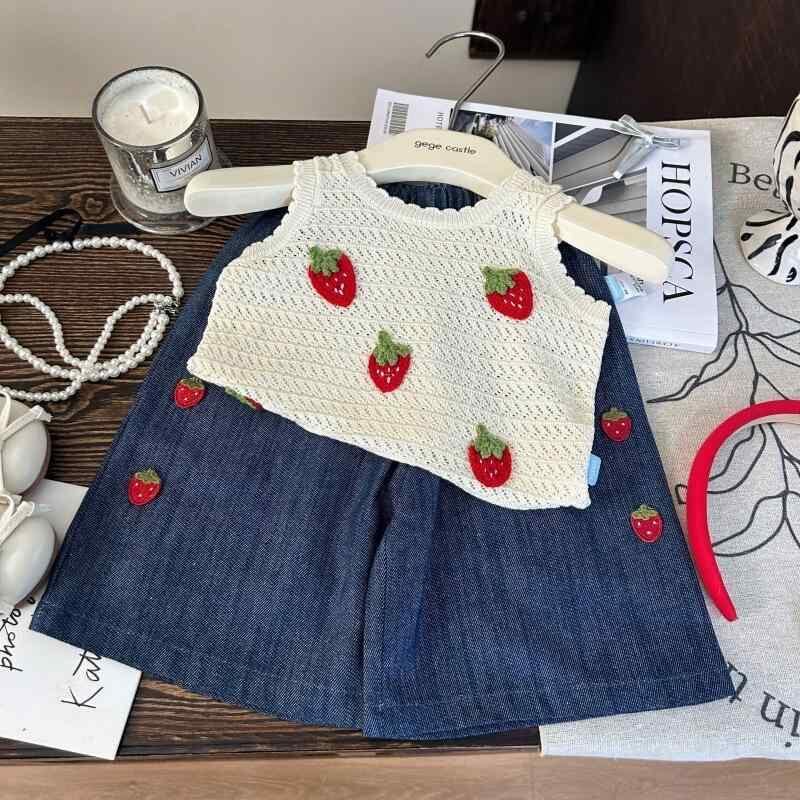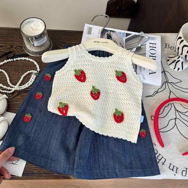 子供服 女の子 韓国スタイル 夏物 イチゴ柄 ニットベスト ノースリーブ 薄手 コットン素材 9分丈 デニムパンツ ジーンズ カジュアル 上下セット