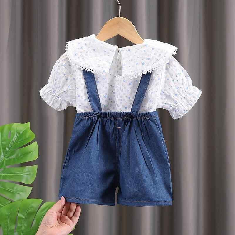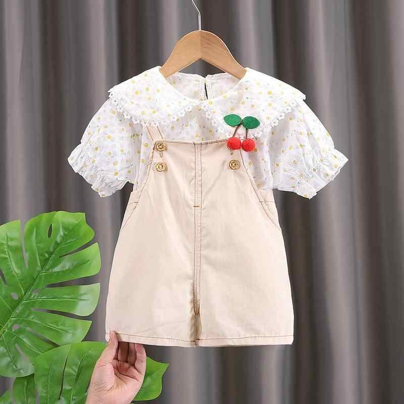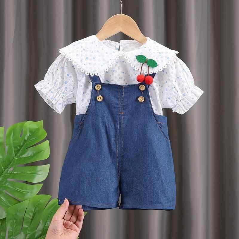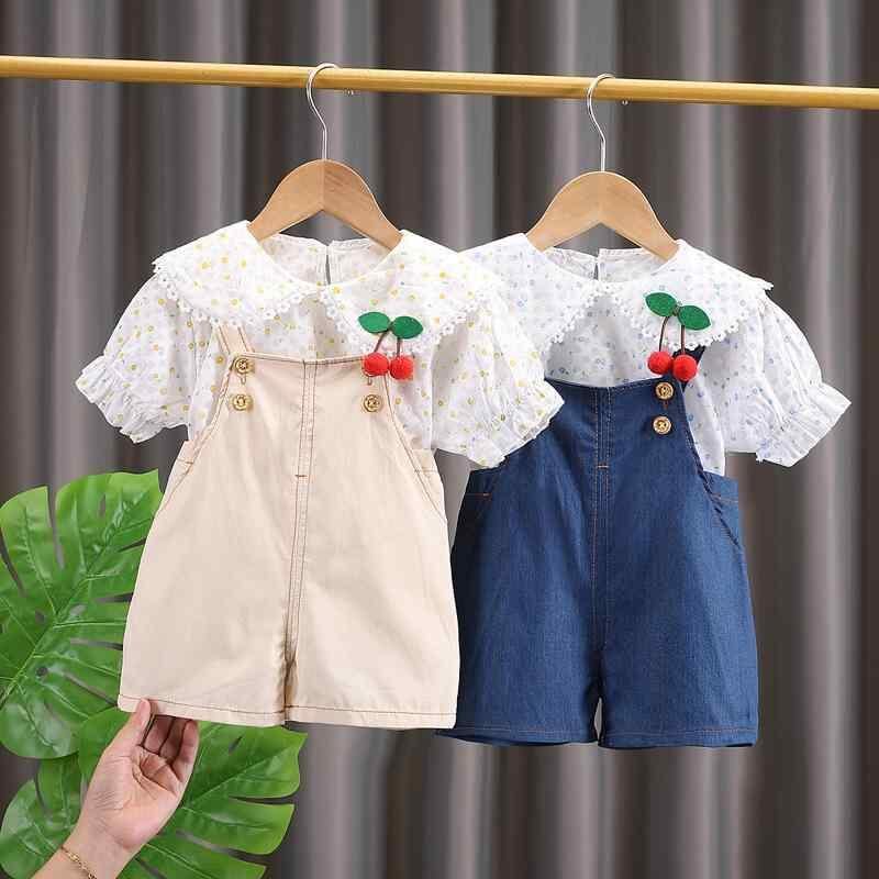 キッズ 女の子 夏服 かわいい 小花柄 ピーターパンカラー 半袖 ブラウス デニム サロペット ショートパンツ 2点セット 綿 コットン 柔らかい 薄手 お出かけ 普段使い チェリー柄 アイボリー系 ブルー系