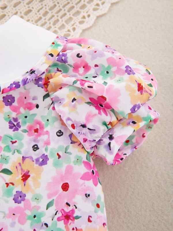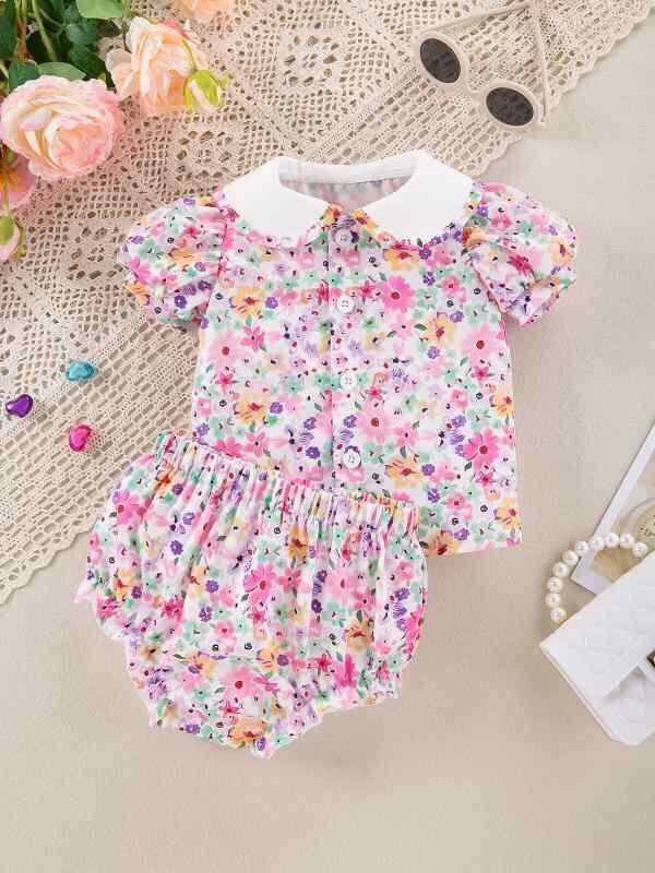 ベビー服 女の子 幼児 小花柄 半袖 ブラウス 襟付き 丸襟 パフスリーブ ショートパンツ 上下セット 2点セット ポリエステル 柔らか素材 韓国風 ピンク 夏
