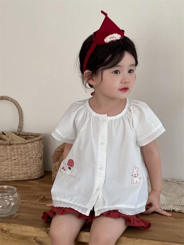 シャツ 女の子 子供 ベビー キッズ 半袖 ブラウス ラウンドネック 丸襟 かわいい ウサギ 刺繍 花柄 フリル レース 綿 コットン 無地 白 カジュアル 普段使い お出かけ 韓国風