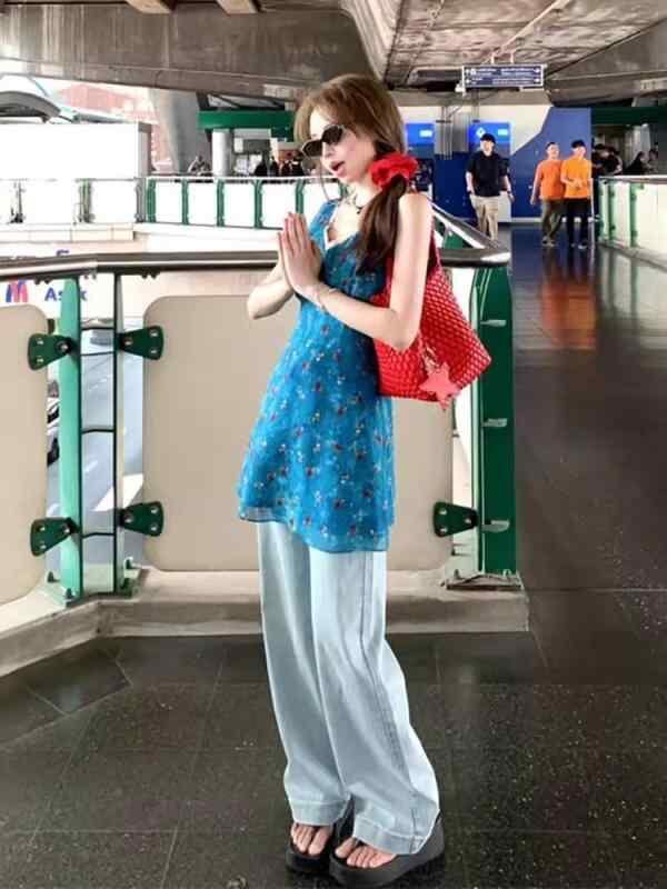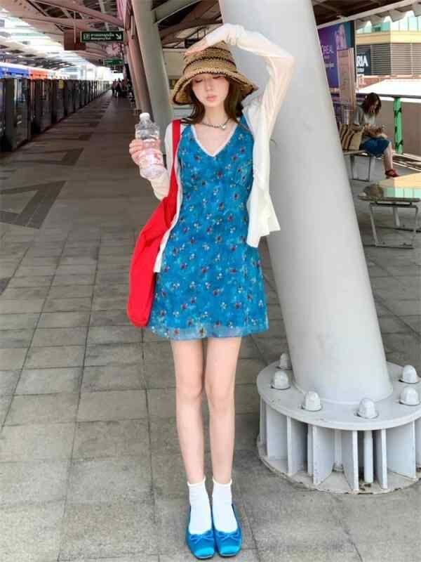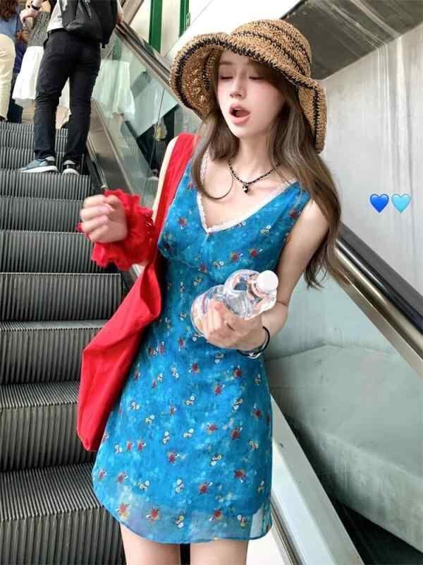 ワンピース レディース ブルー 小花柄 Vネック ショート丈 ミニ丈 低身長向け 大きいサイズ ゆったり 体型カバー Aライン ハイウエスト エレガント リゾート バカンス 旅行 夏服