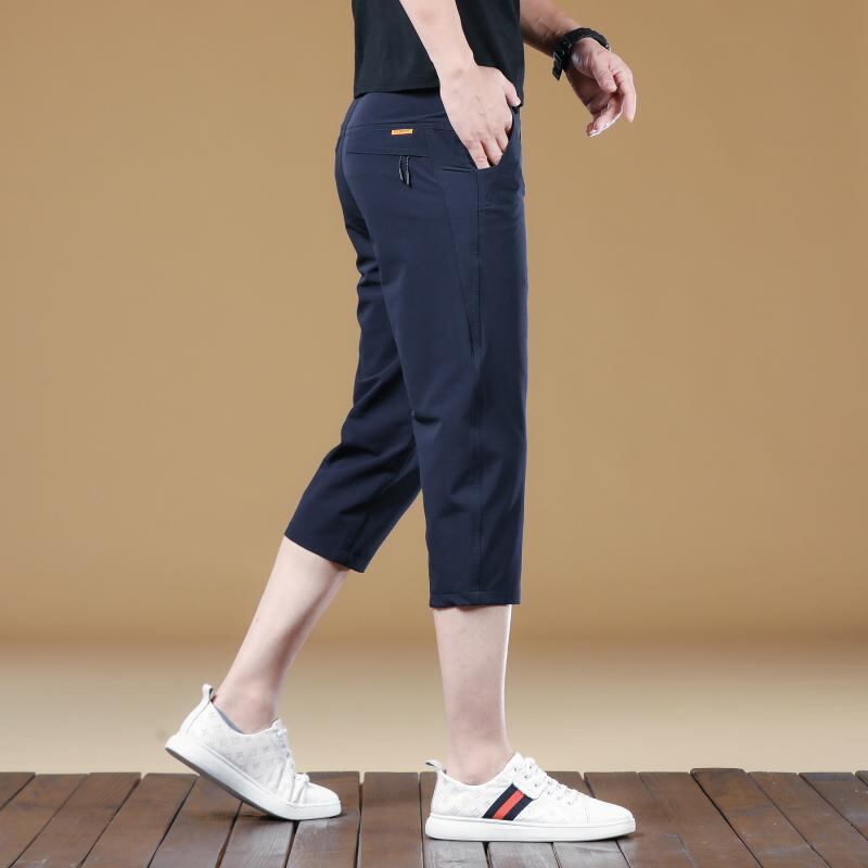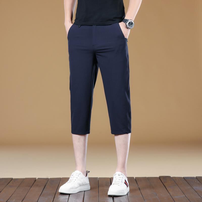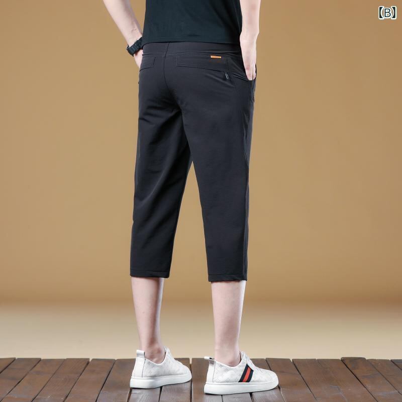 スラックス メンズ 男性用 七分丈 八分丈 接触冷感 薄手 防しわ ウール混 化繊混紡 スリムフィット 細身 カジュアル ビジネス 通勤 オフィス 夏用 ネイビー ブラック