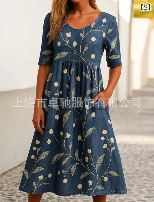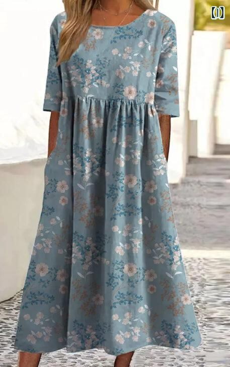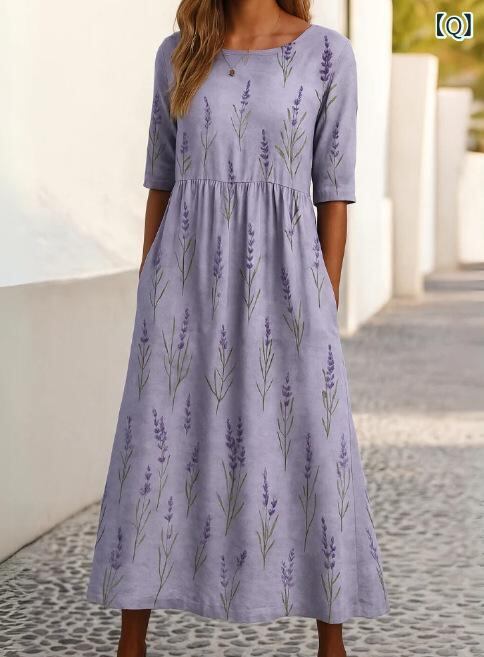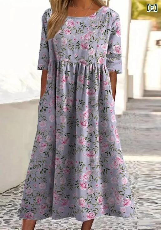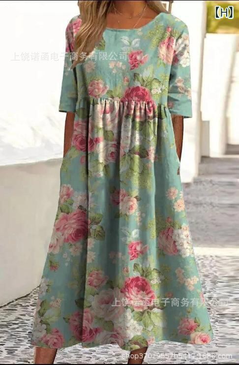 ワンピース レディース 欧米風 ゆったり ルーズフィット Vネック 花柄 プリント ドレス Aライン ミディ丈 半袖 ポリエステル素材 高級感 通勤 オフィス カジュアル 普段使い リラックスウェア