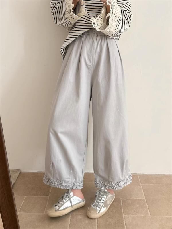 ワイドパンツ レディース レース フリル ハイウエスト ゆったり ストレートシルエット 体型カバー 着痩せ デイリーユース ロングパンツ 薄手 ポケット付き