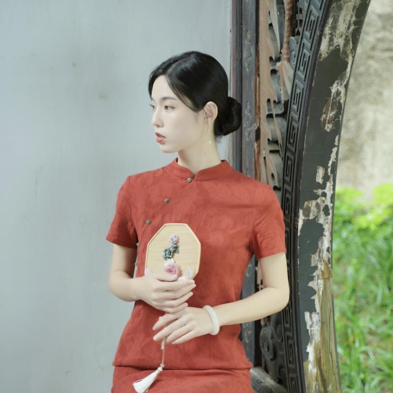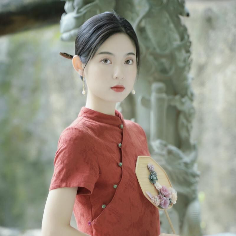 ワンピース レディース チャイナドレス 赤色 レッド 若者向け 改良デザイン エレガント 上品 レトロ クラシカル ジャカード織り スリムフィット タイト 綿 コットン ロング丈 マキシ丈 スタンドカラー 立ち襟 半袖 文芸レトロ カジュアルスタイル
