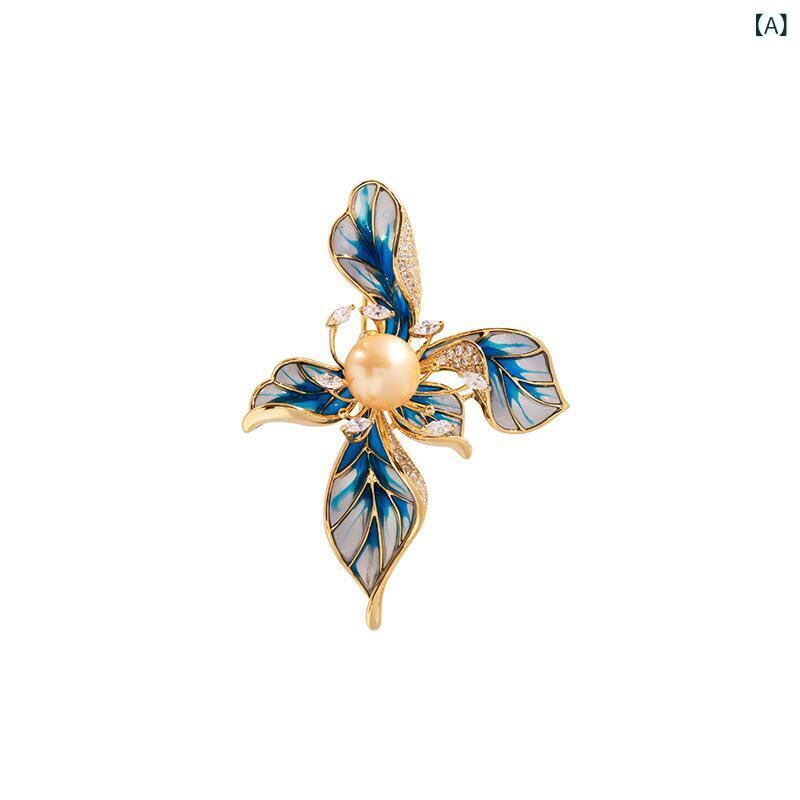 ブローチ レディース フレンチレトロ アイリス フラワー パール ブルーリーフ エレガント 上品 高級感 存在感 銅製 ゴールドメッキ フォーマル オフィス カジュアル ギフト