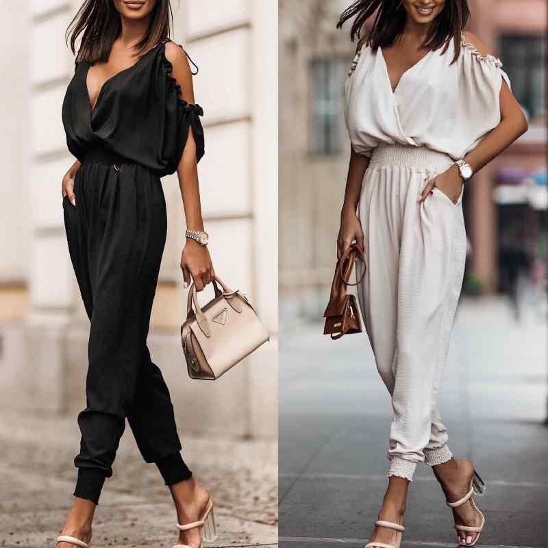 オールインワン レディース ゆったり Vネック ポケット付き ウエストゴム ロング丈 ポリエステル素材 リラックスフィット カジュアル コンビネゾン 通勤 オフィス きれいめ 快適