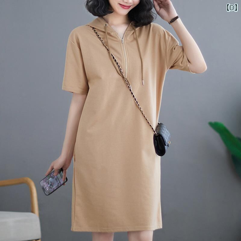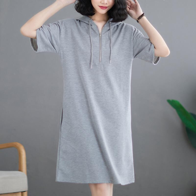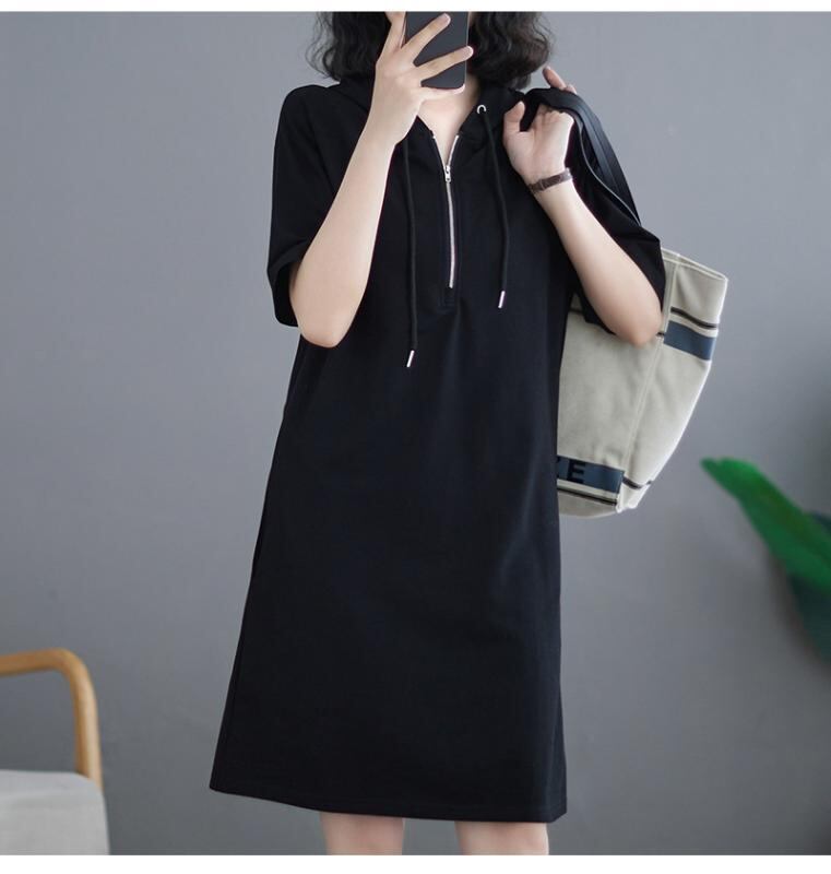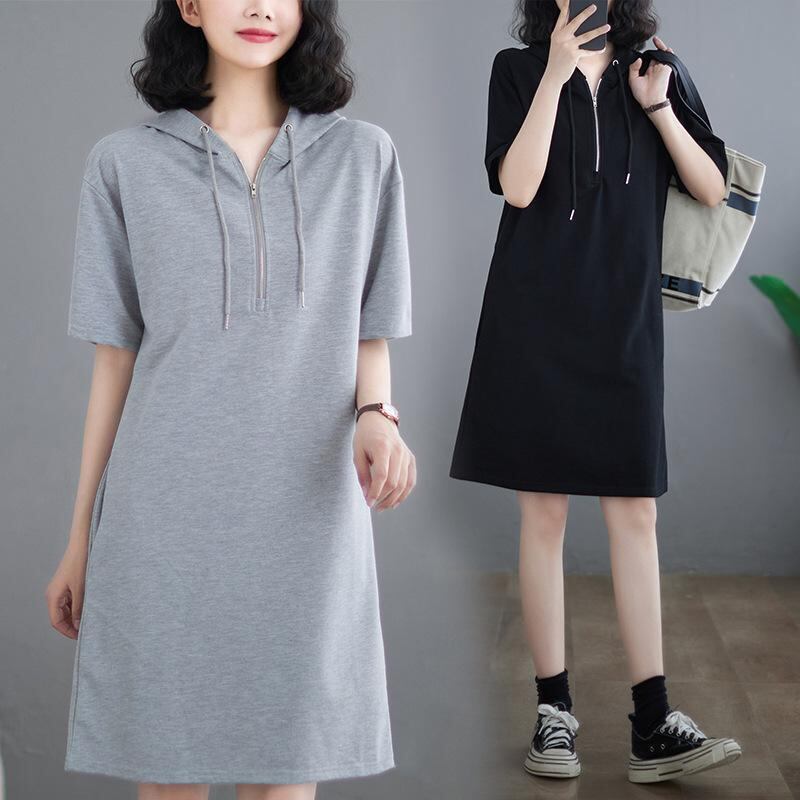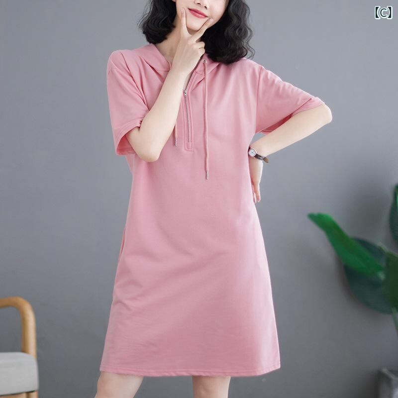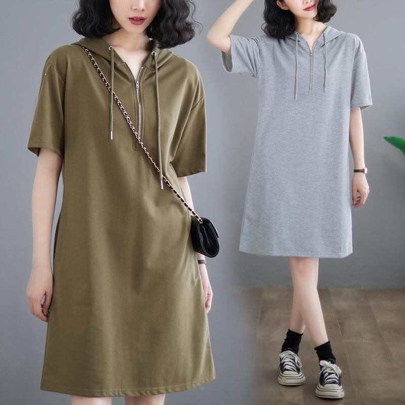 ・カテゴリ: ワンピース ・主な素材: ポリエステル80~90% ・柄: 無地 ・スタイル: ベーシック、日韓カジュアル、エレガント ・丈: ミディ丈 ・スカートシルエット: Aライン ・ネックライン: フード付き ・袖タイプ: レギュラー ・袖丈: 半袖 ・ウエスト: ハイウエスト ・開閉: プルオーバー ・カラー展開: グレー、ブラック、ピンク、カーキ、ミリタリーグリーン ・サイズ展開: M、L、XL、XXL