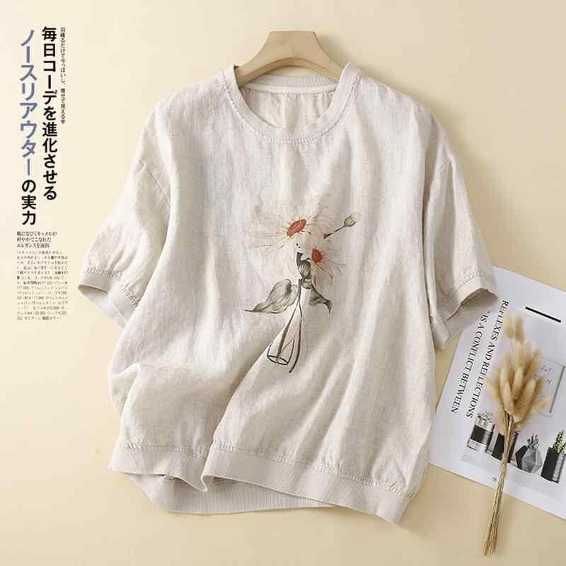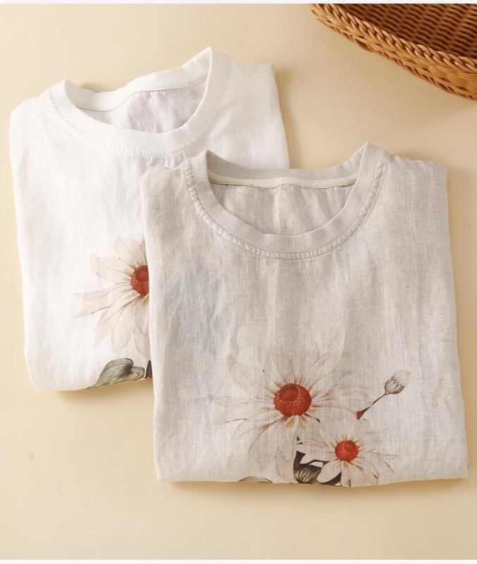 Tシャツ レディース レトロ ヴィンテージ サンドウォッシュ リネン 麻 半袖 ゆったり 薄手 花柄 プリント ラウンドネック カジュアル 夏 白 カーキ