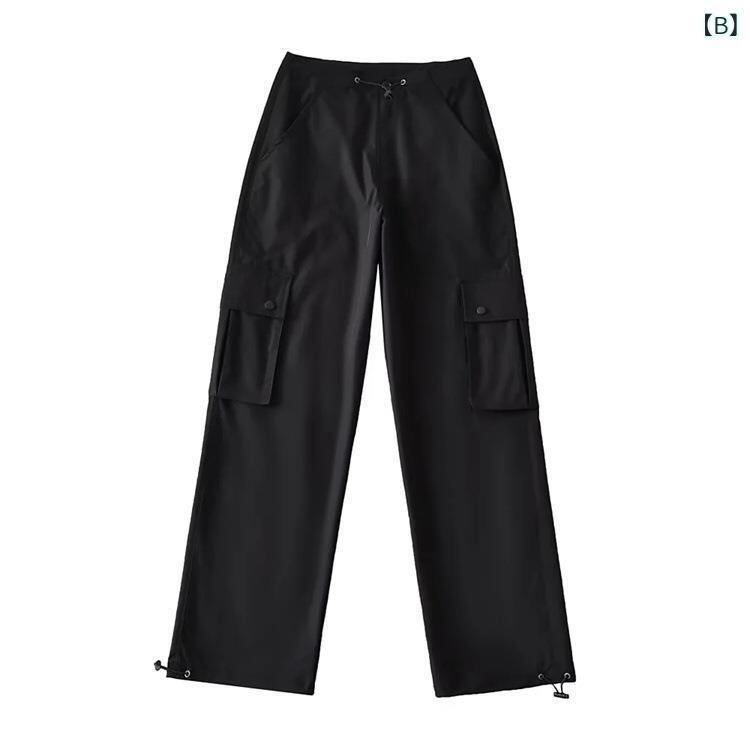 パンツ レディース カーゴパンツ ハイウエスト ドローストリング ポケット ストレート ゆったり ルーズフィット カジュアルパンツ 綿混 シワになりにくい ボトムス シンプル リラックス 普段使い ストリート 春 夏 秋 オールシーズン