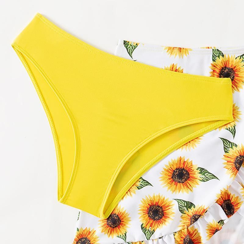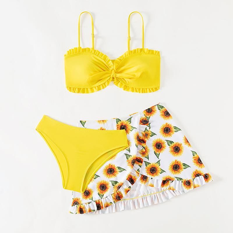 水着 キッズ 女の子 ガールズ かわいい ひまわり柄 向日葵プリント ビキニ 3点セット イエロー 黄色系 プール 海水浴 ビーチ スイミング レジャー 伸縮性 ポリエステル
