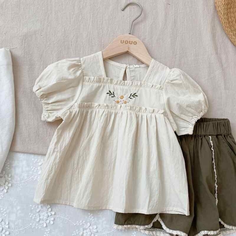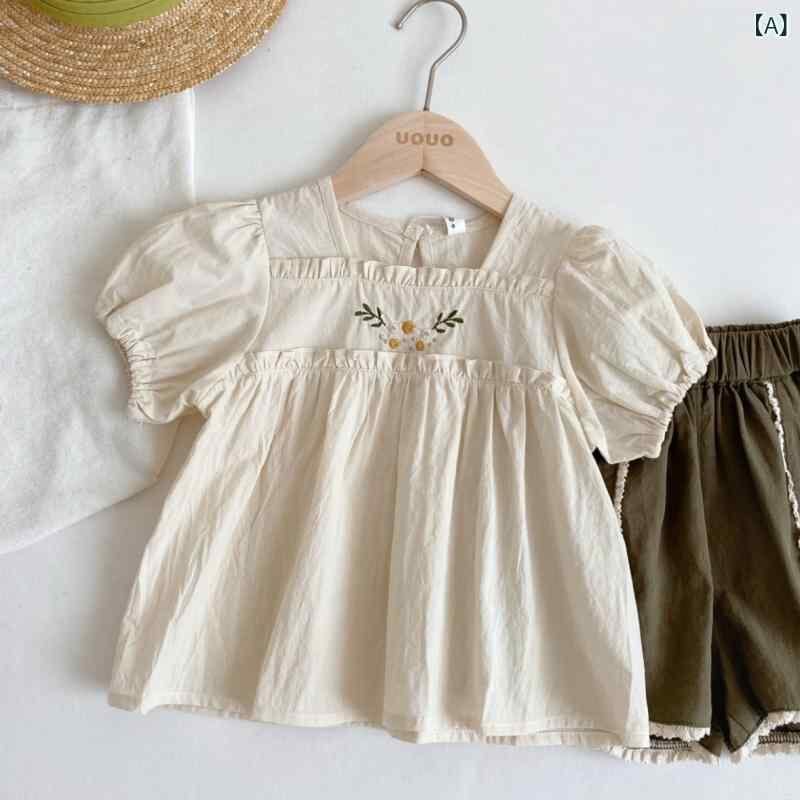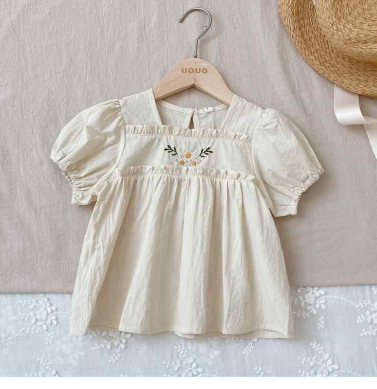 ブラウス 女の子 ベビー キッズ 子供 半袖 刺繍 小花柄 ドールシルエット フレア かわいい 韓国風デザイン スイート ポリエステル生地 ベージュ アイボリー系 トップス フォーマル カジュアル 普段使い お出かけ 通園
