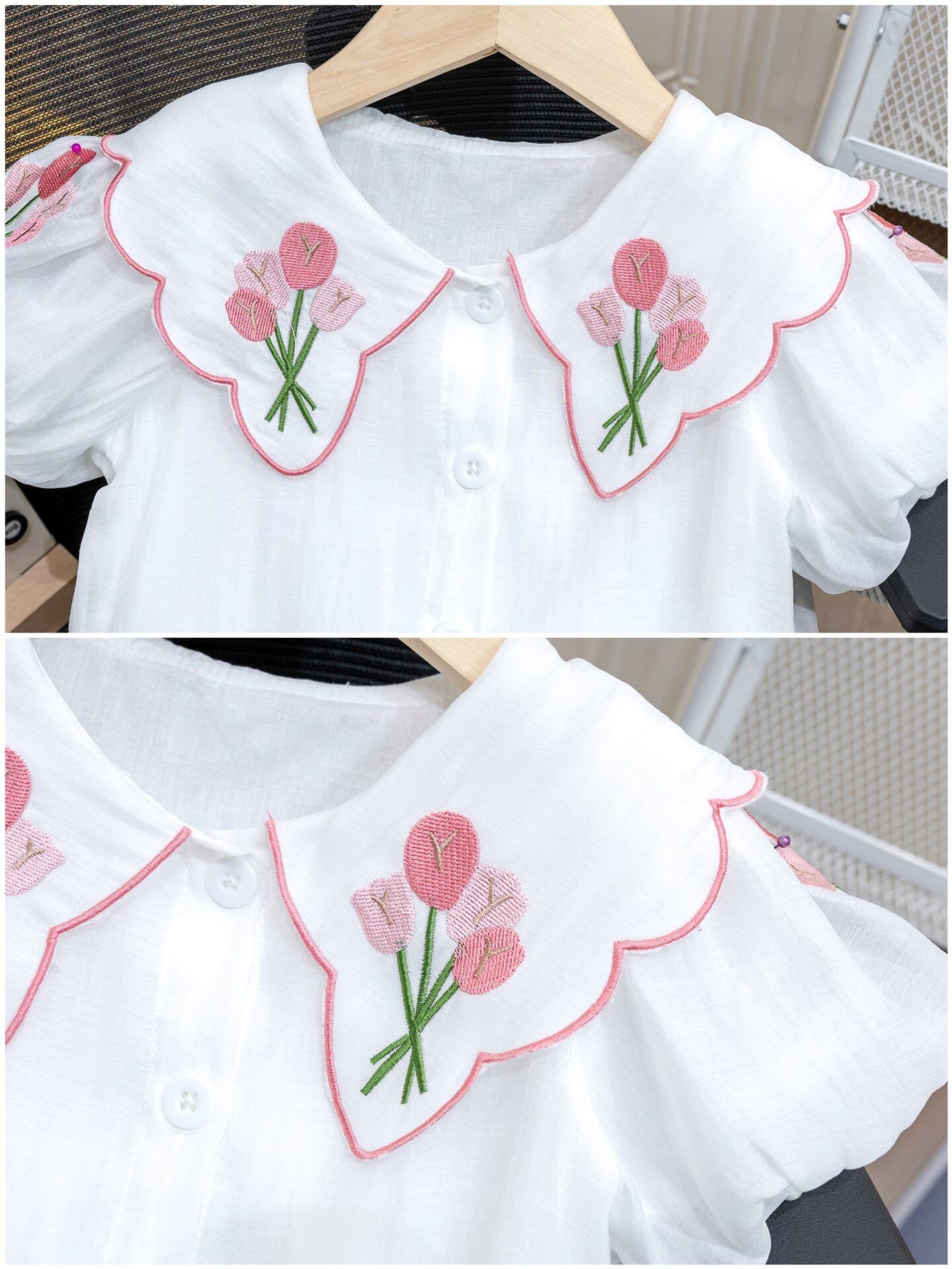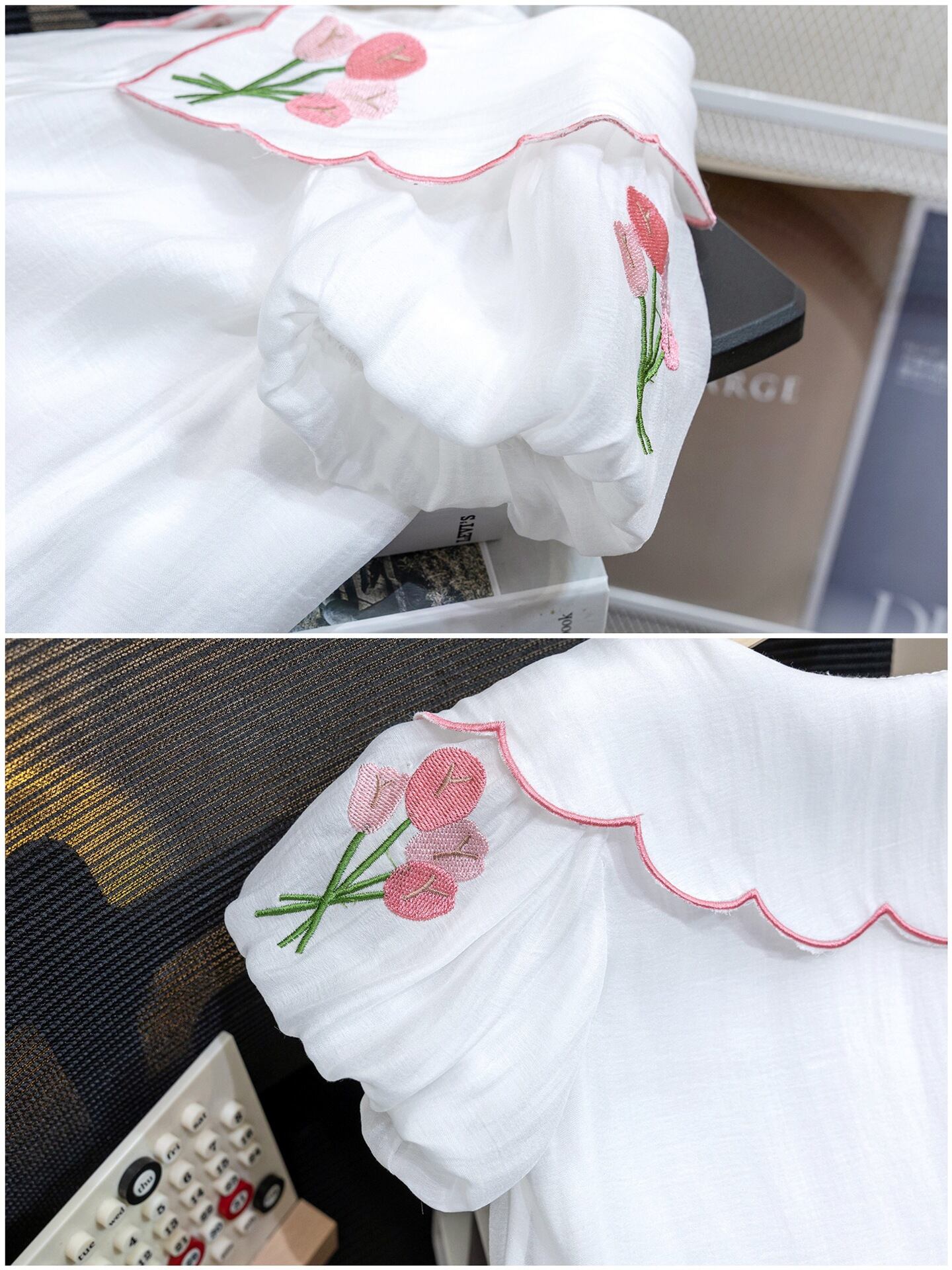 ブラウス キッズ 女の子 子供 Aライン ふんわり 花柄 刺繍襟 半袖 綿 コットン トップス 着回し 普段使い 通園 通学 かわいい ホワイト イエロー パープル